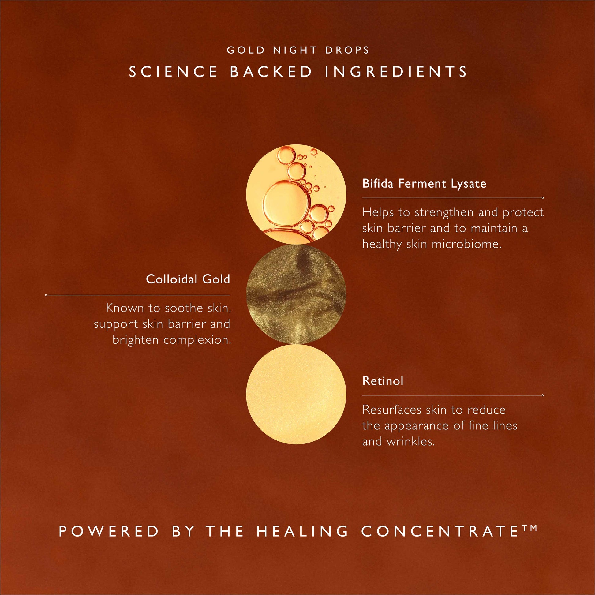 Gold Night Drops replenishing ingredients result in a transformative triple-action treatment.
