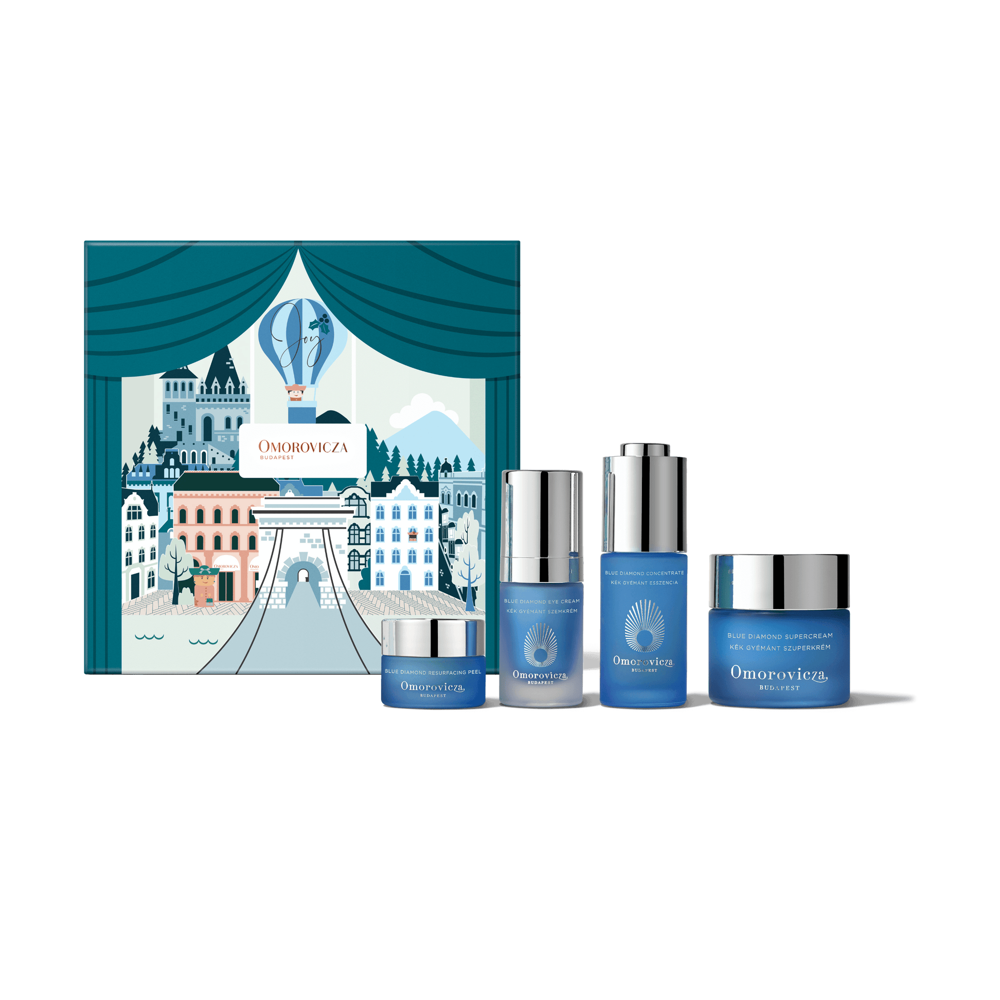 Elevate your regime for skin longevity and vitality. This carefully curated gift set comprises four powerful formulas from our Blue Diamond Collection. Blue Diamond Concentrate redensifies and smooths. Blue Diamond Supercream firms and strengthens. Blue Diamond Eye Cream lifts and energises the eye contour. Blue Diamond Resurfacing Peel gently refines for a luminous complexion.