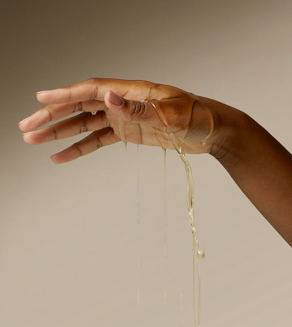 A detailed shot showcasing a hand generously coated with Firming Body Oil.