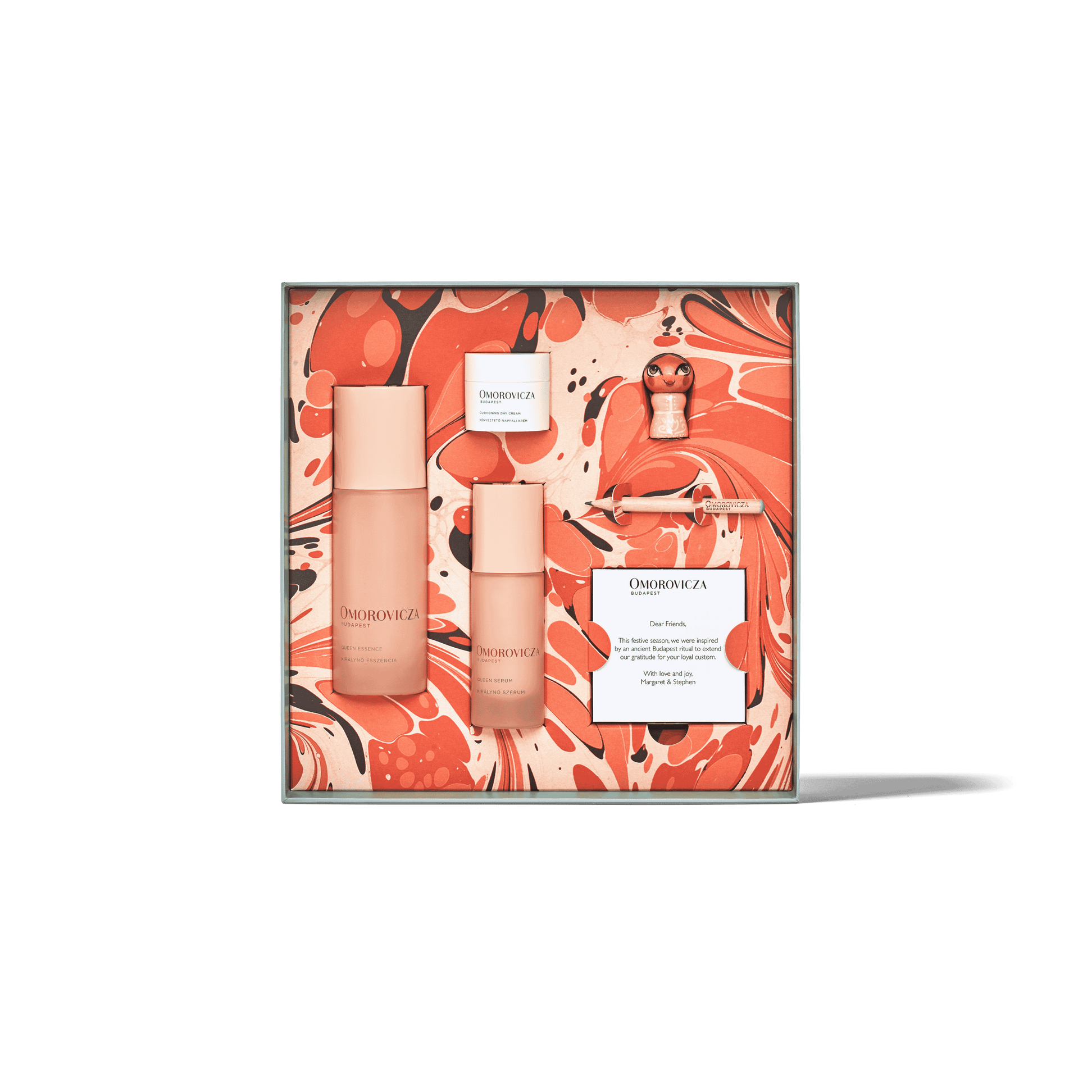 Queen Serum: Aqua (Water), Glycerin, Aqua (Hungarian Thermal Water), Saccharomyces (Hungarian Thermal Water) Ferment Extract, Triheptanoin, C13-16 Isoalkane, Olive Oil Decyl Esters, Caprylic/Capric Triglyceride, Squalane, Cetearyl Olivate, Sorbitan Olivate, Cetearyl Alcohol, Benzyl Alcohol, Lithops Pseudotruncatella Callus Lysate, Sodium Hyaluronate, Propanediol, Phospholipids, Sodium Benzoate, Potassium Sorbate, Parfum (Fragrance), CI 77891 (Titanium Dioxide), Squalene, Carbomer, Algae Oligosaccharides, Salicylic Acid, Synthetic Fluorphlogopite, Sodium Hydroxide, Aluminium Oxide, Tocopherol, Leuconostoc/Radish Root Ferment Filtrate, Pentylene Glycol, Xanthan Gum, Engelhardtia Chrysolepis Leaf Extract, Sorbic Acid, Xanthophylls, Lecithin, CI 77491 (Iron Oxides), Cyamopsis Tetragonoloba (Guar) Gum, Silica, Tin Oxide, Phytic Acid, Lactic Acid, Palmitoyl Tetrapeptide-7, Citronellol, Geraniol, Linalool, Limonene. Queen Essence: Aqua (Water), Pentylene Glycol, Propanediol, Aqua (Hungarian Thermal Water), Glycerin, 2,3-Butanediol, Saccharomyces (Hungarian Thermal Water) Ferment Extract, Ethylhexylglycerin, Chondrus Crispus Powder (Carrageenan), Xanthan Gum, Caprylyl/Capryl Glucoside, Phospholipids, Sodium Hyaluronate, Glucose, Rosa Damascena Extract, Gluconolactone, Tremella Fuciformis (Mushroom) Extract, Lactic Acid, Leuconostoc/Radish Root Ferment Filtrate, Sodium Benzoate, Solanum Lycopersicum (Tomato) Leaf Cell Culture Extract, Decyl Alcohol, Calcium Gluconate, Citronellol, Geraniol.