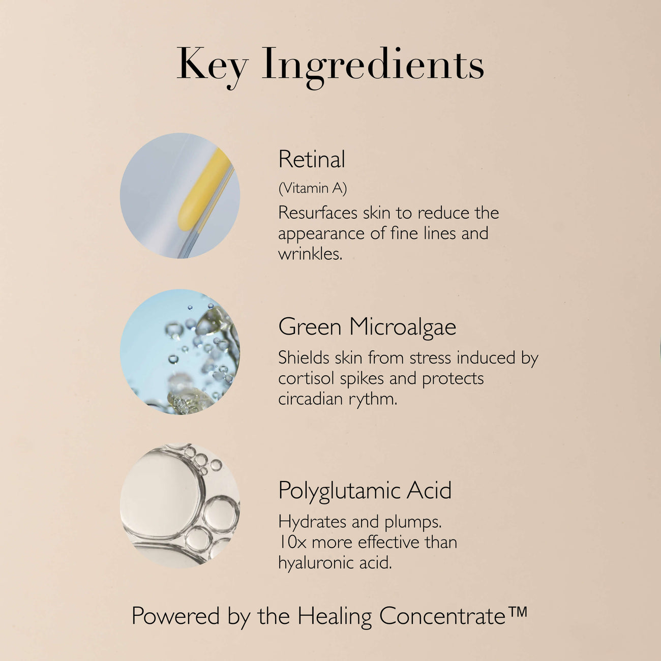 Aqua (Hungarian Thermal Water), Glycerin, Simmondsia Chinensis (Jojoba) Seed Oil, Bifida Ferment Lysate, Saccharomyces (Hungarian Thermal Water) Ferment Extract, Lactococcus Ferment Lysate, Helianthus Annuus (Sunflower) Seed Oil, Caprylyl/Capryl Glucoside, Leuconostoc/Radish Root Ferment Filtrate, Xylitylglucoside, Avena Sativa (Oat) Kernel Oil, Hydrolyzed Jojoba Esters, Cyclodextrin, Bakuchiol, Anhydroxylitol, Citrus Limon (Lemon) Peel Powder, Sclerotium Gum, Sodium Polyglutamate, Xylitol, Amorphophallus Konjac Root Extract, Phospholipids, Cocos Nucifera (Coconut) Fruit Extract, Hyaluronic Acid, Parfum (Fragrance), Rubus Chamaemorus (Cloudberry) Seed Oil, Glucose, Ceteareth-25, Pentylene Glycol, Retinal, Lupinus Albus Seed Extract, Cetyl Alcohol, Plankton Extract, Saccharomyces/Copper Ferment, Saccharomyces/Iron Ferment, Saccharomyces/Magnesium Ferment, Saccharomyces/Silicon Ferment, Saccharomyces/Zinc Ferment, Lonicera Caprifolium (Honeysuckle) Flower Extract, Sodium Chloride, Behenic Acid, Ceramide Np, Cholesterol, Lonicera Japonica (Honeysuckle) Flower Extract, Acetic Acid, Tocopherol, Ceramide Ns, Ceramide Ap, Ceramide Eop, Ceramide Eos, Caprooyl Phytosphingosine, Caprooyl Sphingosine, Lactobacillus, Lactic Acid, O-Cymen-5-Ol, Benzyl Alcohol, Sodium Benzoate, Cinnamyl Alcohol, Geraniol, Linalool, Sorbitol.