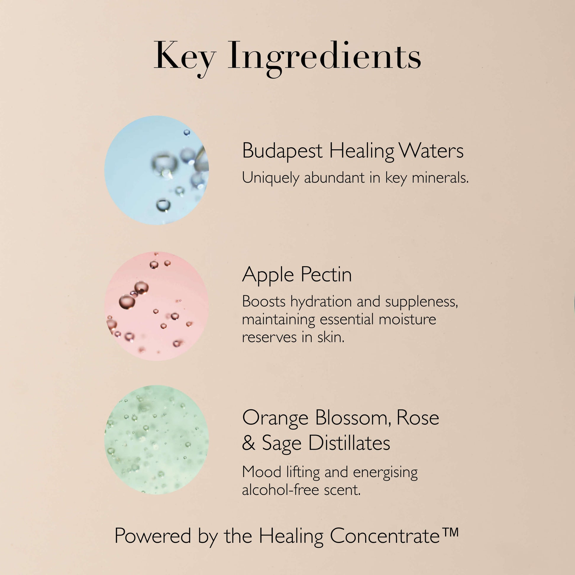 Aqua (Hungarian Thermal Water), Glycerin, Polysorbate 20, Phenoxyethanol, Pyrus Malus (Apple) Fruit Extract, Saccharomyces (Hungarian Thermal Water) Ferment Extract, Disodium EDTA, Ethylhexylglycerin, Mannitol, Malpighia Punicifolia (Acerola) Fruit Extract, Chlorella Vulgaris/Lupinus Albus Protein Ferment, Pectin, Rosa Damascena Flower Water, Citrus Aurantium Dulcis (Orange) Flower Water, Salvia Officinalis (Sage) Leaf Water, Phospholipids, Yeast Extract, Linalool, Geraniol, Citronellol.